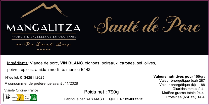 Issu de porc Mangalitza (mangalica en français), cochon rare de la Hongrie, élevé en Occitanie en plein air.